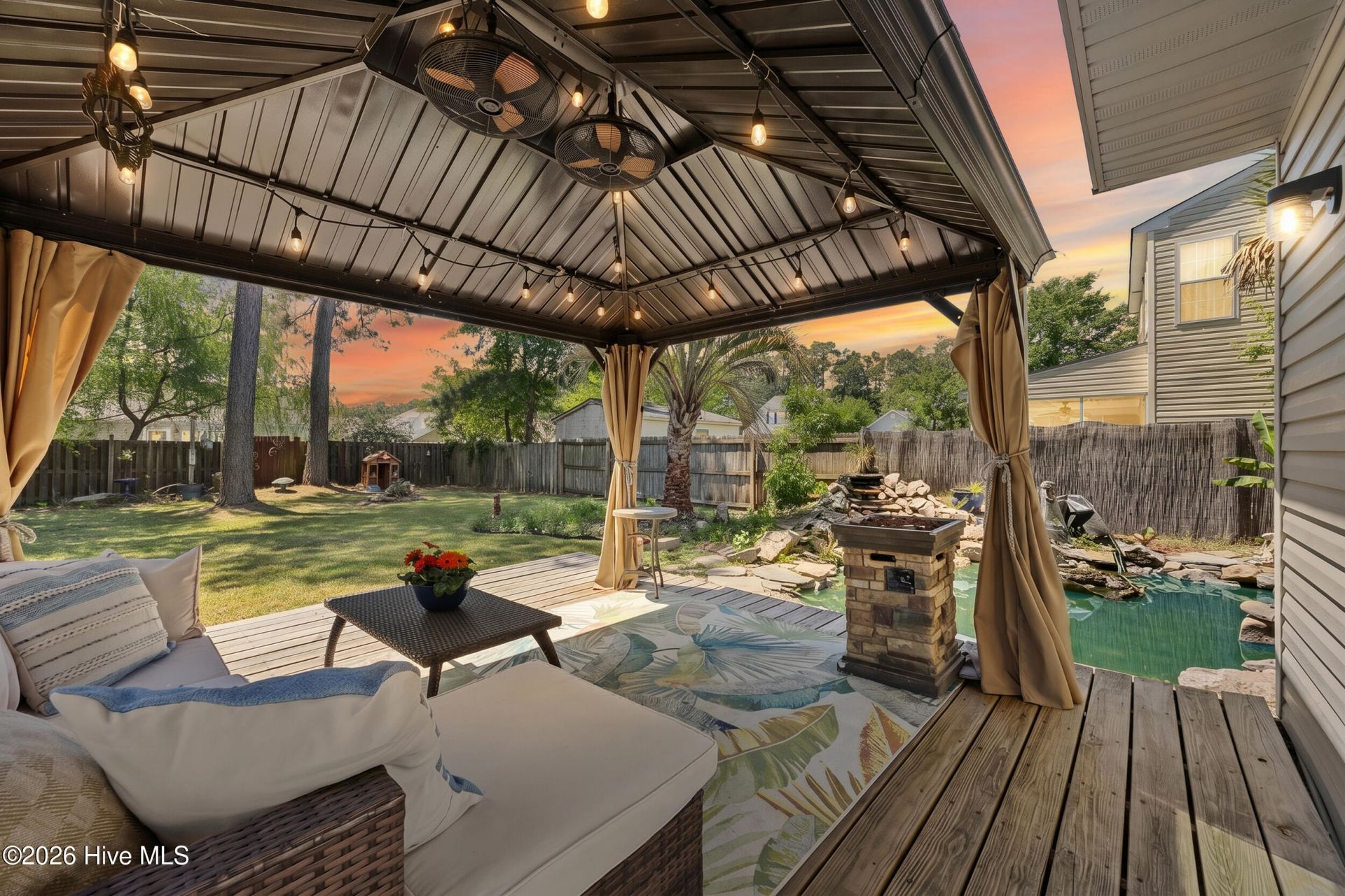 Fully furnished, no HOA, and a $3,000 buyer credit! This 4-bedroom, 2.5-bath home perfectly balances everyday livability with turnkey investment potential. Whether you're seeking a primary residence or an income producing rental, this property is move-in ready and ideally located just minutes from Westgate Shopping, Belville's Riverwalk Park, and the heart of Downtown Wilmington. The main level features an open flow designed for effortless entertaining. The living room transitions seamlessly into the dining area and kitchen, where you'll find convenient access to the laundry, a half bath, and the attached garage. Upstairs, the primary bedroom features a walk-in closet and a private bath with double vanity. Three additional bedrooms and a second full bath provide flexible space for guests, work, or hobbies. One bedroom is currently set up as a yoga and meditation space. Step through the new sliding doors and discover what truly makes this home special. The fully fenced backyard feels like your own private retreat, featuring a spacious yard, large deck with gazebo, and a tranquil koi pond with a cascading waterfall that creates a serene, water garden ambiance. It's an outdoor space designed for relaxation, entertaining, and everyday enjoyment. In the front, a rocking-chair porch and mature landscaping offer a warm welcome every time you pull into the three-car driveway. Modern efficiency meets peace of mind with several recent updates: a solar whole-home water filtration and softener system, a new dishwasher, new attic insulation, and a Trane HVAC enhanced with a Turbo 200X capacitor for peak performance.With shopping, dining, and the airport all nearby, this home offers the ultimate coastal lifestyle. Take advantage of the $3,000 buyer credit and ask about our preferred lender incentives. Come see it in person - and plan to stay a few extra minutes to relax in the backyard and soak in the view!