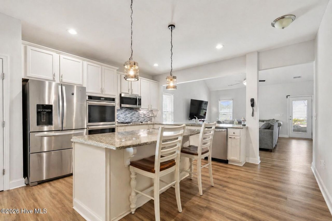 Best Value in Mimosa Bay | Corner Lot | Outdoor Living | Move-In ReadyIdeally located just 5 miles from the Camp Lejeune back gate and only 4 miles to North Topsail beaches, this beautifully maintained 4-bedroom home offers the perfect balance of space, functionality, and coastal living.Situated on a landscaped corner lot, the property truly shines with exceptional outdoor living spaces, including a welcoming front porch with peaceful pond views, a screened-in porch, and an extended patio within a fully fenced backyard--perfect for relaxing or entertaining.Inside, you'll find a bright, open-concept layout designed for everyday comfort:First-floor primary suite offering privacy and convenienceSpacious living area featuring a custom 5-speaker surround sound systemCustom-fit blinds throughout for a true move-in ready experienceThe kitchen serves as the heart of the home, thoughtfully designed for both function and gathering:Granite countertopsOversized islandUpgraded gas range with double ovenSeamless flow into the main living areaUpstairs offers flexible living space to fit your needs:Three additional bedrooms with vaulted ceilingsLarge loft ideal for a media room, office, or play areaWired for cable and internet throughoutWhat truly sets this home apart in its price point:Screened porch and extended patio combinationFully fenced backyard on a premium corner lotIrrigation system already installed10x20 wired shed for storage or workspaceMounted outdoor TV includedLocated within a gated communityThis home is competitively priced and thoughtfully upgraded to stand out. Schedule your private showing today--opportunities like this don't last.