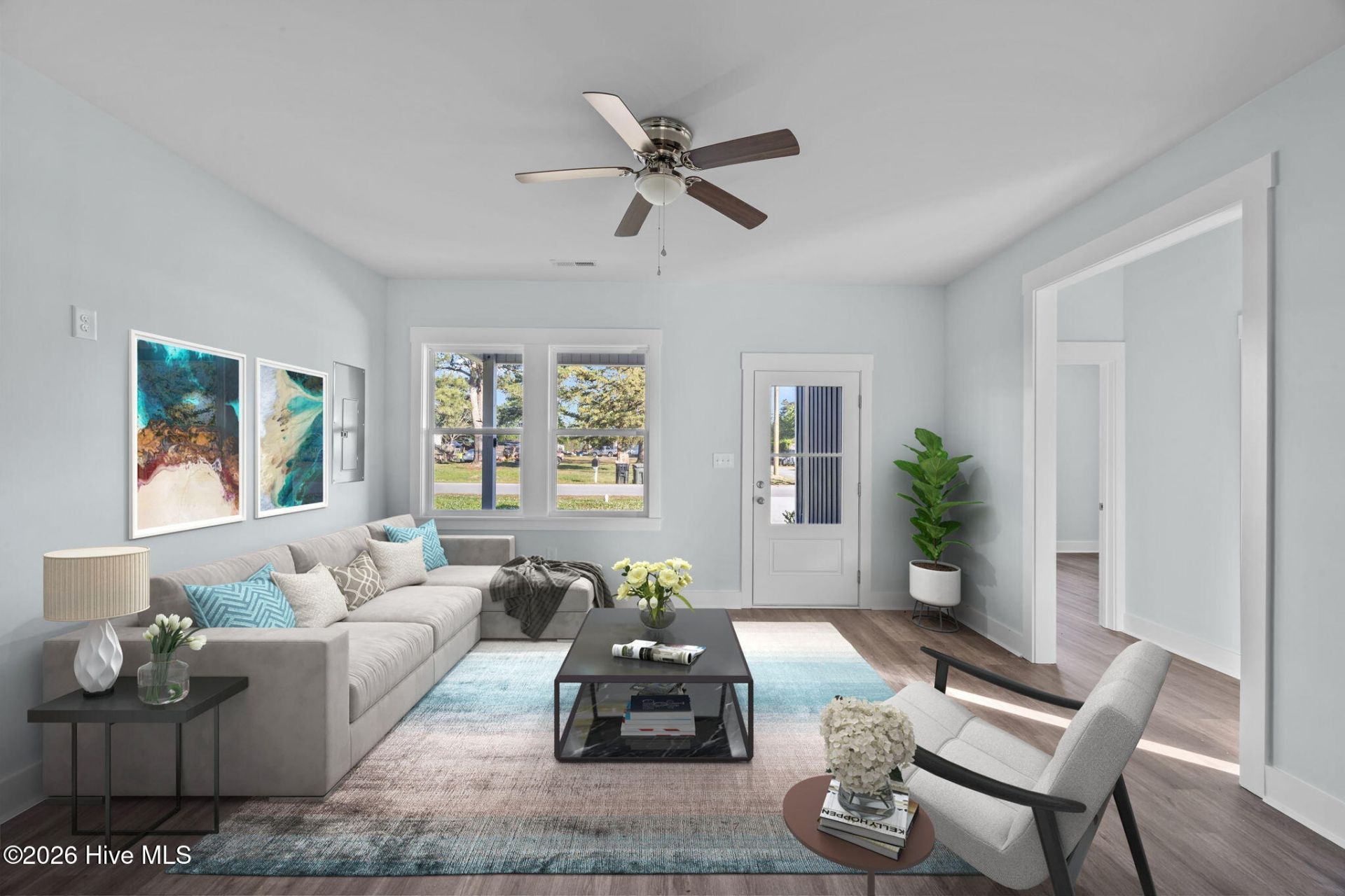 If you've been waiting for a brand-new home without the brand-new price tag, this is it. This 3-bedroom, 2-bathroom home in Vanceboro delivers 1,352 square feet of thoughtfully designed living space, all on a clean slate with no prior owners, no deferred maintenance, and no surprises. The open floor plan connects the living area, dining space, and kitchen in a way that actually works for everyday life. Dark luxury vinyl plank floors run throughout, the kitchen features white shaker cabinets, granite countertops, and a peninsula that's equally useful for meal prep or morning coffee. A sliding glass door off the main living area opens to a covered rear patio and a flat backyard with room to breathe. The primary suite is well-separated from the secondary bedrooms and includes a private bath with double vanity, granite countertops, and a beautiful shower, plus a large closet. The two additional bedrooms each have their own closets and ceiling fans. The hall full bath serves the rest of the home, and a dedicated laundry room keeps the everyday clutter out of the living areas. Outside, the covered front porch, concrete driveway, and fresh landscaping give this home strong curb appeal from the start. The lot sits in a quiet area of Vanceboro with open views and a rural feel, just a short drive to Havelock, New Bern, and Cherry Point. This home checks the boxes that matter most: new construction quality, low-maintenance finishes, and a price point that makes sense.