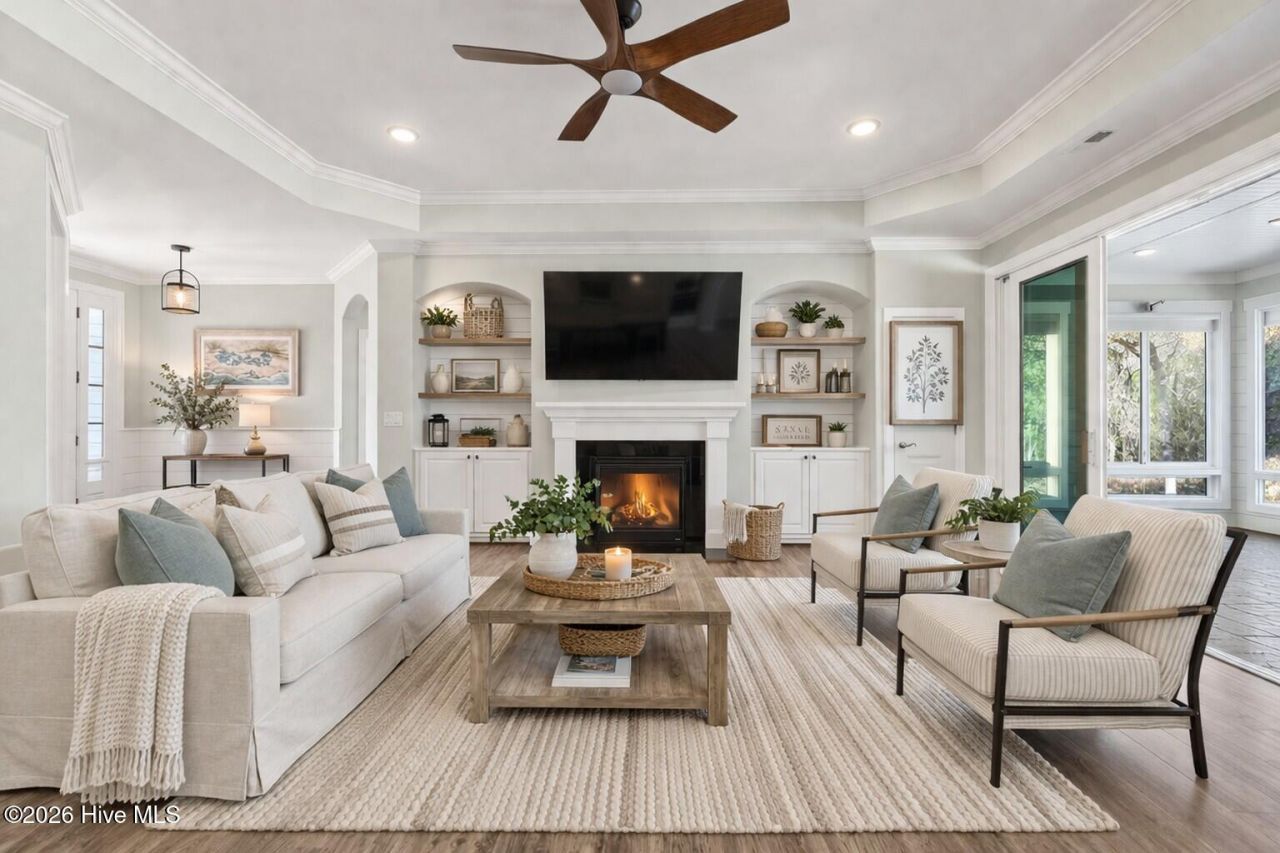 Stunning Coastal Retreat in Impeccable Condition! Step into this beautifully designed home where every detail has been thoughtfully curated. From the moment you enter, you're welcomed by elegant shiplap accents, coastal-inspired colors, abundant natural light, soaring 9' ceilings, & detailed trim work throughout. Luxury plank flooring flows seamlessly into a warm & inviting living room featuring custom built-in shelving, tray ceiling & gas fireplace with fan. Gourmet kitchen is a true showpiece, centered around a massive 9' island with granite counters. Outfitted for both everyday living and entertaining, it includes a quiet Bosch dishwasher, pot filler, 5 burner gas range, wall oven & smart-enabled microwave & oven. Thermador refrigerator with interior water dispenser, coffee bar, walk-in pantry with custom shelving and instant hot water elevate both convenience & luxury. Dining area showcases a tray ceiling, expansive windows & shiplap accents, creating a bright & inviting gathering space. Motorized shades throughout the home add modern ease & comfort. Private office with French doors offers the perfect workspace, while rounded corners throughout the home add a soft, custom feel. Private primary suite is a true retreat, with a tray ceiling, abundant windows, 2 walk-in closets. The spa-like ensuite bath boasts a zero-entry tiled shower, instant hot water, linen closet & water closet. A convenient pocket door connects directly to the laundry room, complete with utility closet & drying rack. Guest bedrooms are generously sized with large closets, and the upstairs suite includes a full bath--ideal for guests or additional privacy. A massive walk-in attic provides exceptional storage. Relax year-round in the sunroom with double sliders, surrounding slider windows, stamped concrete flooring, overlooking the resort-style backyard. An outdoor oasis featuring a luxurious 46' saltwater pool with color-changing lights, sprayers, tanning ledge, ample seating areas. The outdoor space is equally impressive with a propane line for grilling, hot tub wiring, outdoor shower with pet washing wand, palm trees, roses, and exterior lighting on timers. Additional highlights include: Spacious garage with built-in shelving, Tankless water heater, Three 50-amp outlets (perfect for EV, RV, and generator), 3.5-ton HVAC system with three zones (main home, sunroom, upstairs), Gutters, floodlights, additional concrete pad ideal for boat parking (one of few homes where this is allowed). Located in a gated waterway community with access to the Intracoastal Waterway, this home offers the perfect blend of luxury, comfort, and coastal lifestyle. Within 10-15 minutes to the beach, shopping, dining, golf, fresh seafood markets & entertainment.