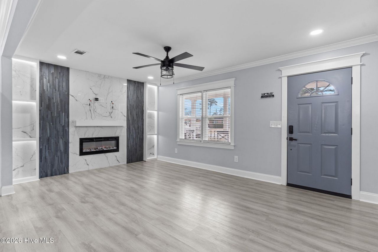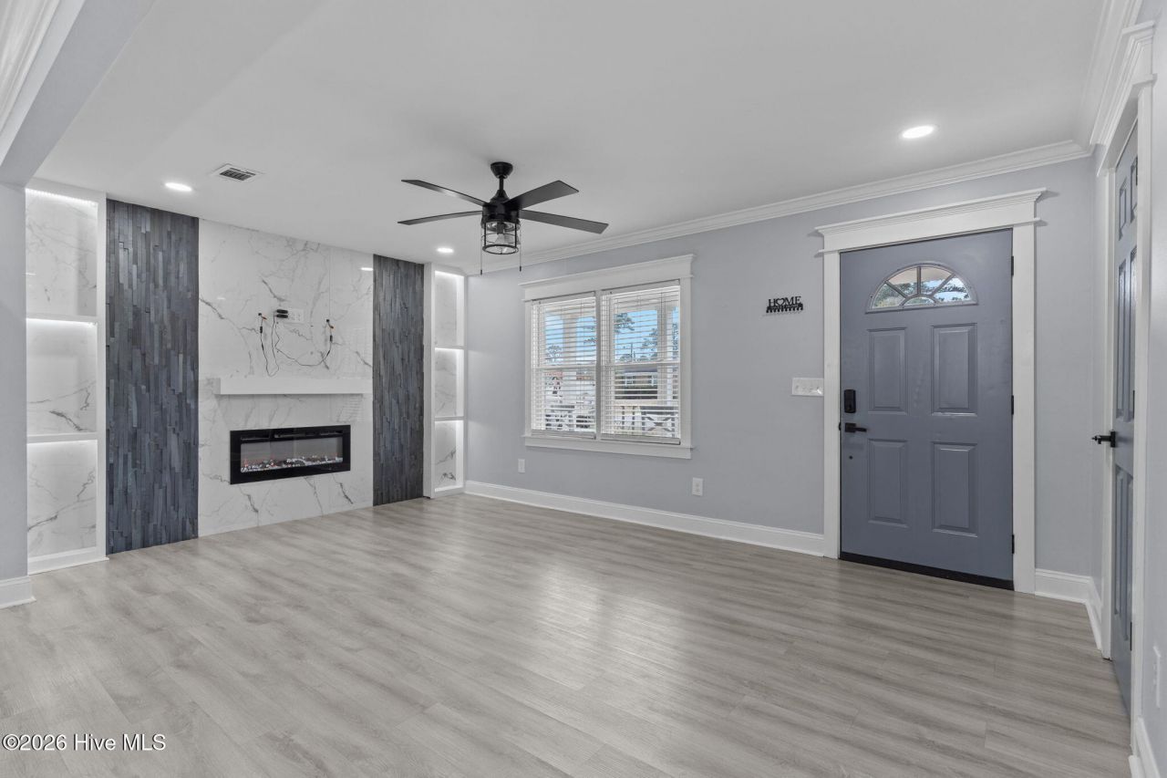 Welcome to a rare find in one of Wilmington's established and desirable areas. Located in the sought-after Kings Grant corridor of Wilmington, NC, 4509 Kings Drive is a fully reimagined brick ranch that blends timeless construction with striking modern updates and it is anything but ordinary.Set among winding streets and mature landscaping, this home offers the charm of a classic neighborhood with the convenience today's buyers demand. Just minutes from Wrightsville Beach, close to downtown Wilmington's vibrant dining and cultural scene, near midtown shopping and medical hubs, and with easy access to Wilmington International Airport and major interstates, the location is simply unmatched.Completely Updated | Move-In ReadyThis 3-bedroom, 1-bath brick ranch has been thoughtfully renovated to create a modern, open-concept living experience:Spacious open living area ideal for entertainingGorgeous updated kitchen featuring granite countertops and modern finishesCustom-installed entertainment wall with built-in shelving and electric fireplace, a true focal pointLuxury vinyl plank flooring throughout living spaces and bedroomsStunning, fully customized bathroom with walk-in showerEvery detail reflects quality craftsmanship and intentional design.Bonus Flex Space Like No OtherThe updated garage is a showstopper, finished with:Central heat and airCeramic tile flooringCustom TV wall with shelvingWhether used as a media room, gym, home office, hobby space, or climate-controlled storage, this versatile area dramatically enhances the home's functionality and value.Outdoor Living & Practical PerksLarge, fully fenced backyardPatio perfect for grilling and gatheringsOversized drivewayDouble gate access to the backyard ideal for boat parking.With Wrightsville Beach just minutes away, the ability to securely store your boat at home is a rare opportunity.